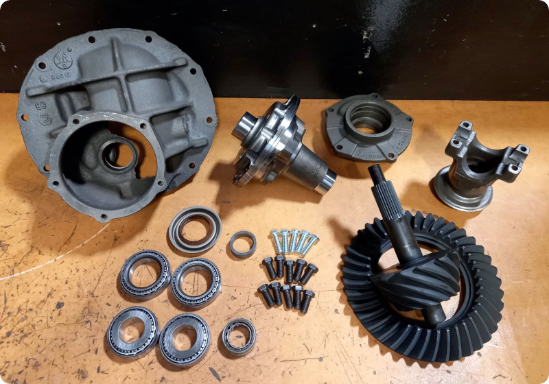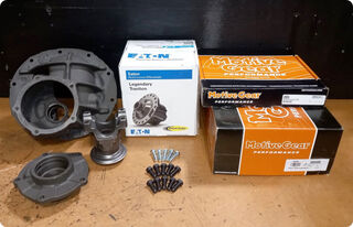 We start our 500HP Ford 9 inch third member builds with an acid dipped factory gear case & pinion support. Hot street & circuit applications use the Eaton Truetrac worm style carrier. Motive Gear Performance ring & pinion. Motive Gear/Timken bearing kits. Solid pinion spacer. We standardise our Ford builds with short 1330 nodular iron pinion yokes (large Ford size).